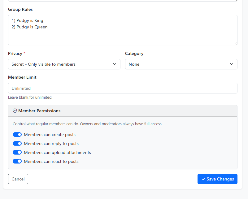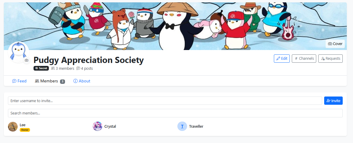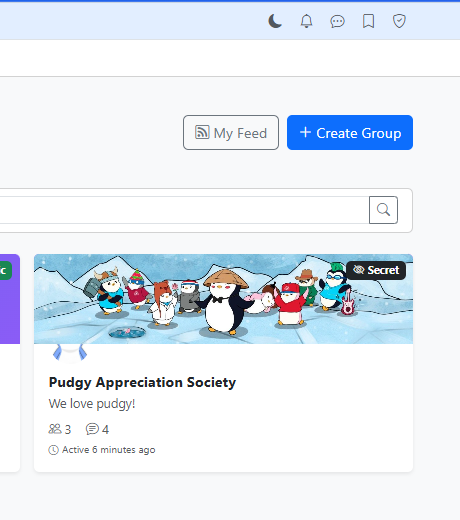 Any member with permission can spin up a new group with a name, description, and optional rules. Groups get their own dedicated page with a customizable icon and cover image, giving each one a distinct identity.