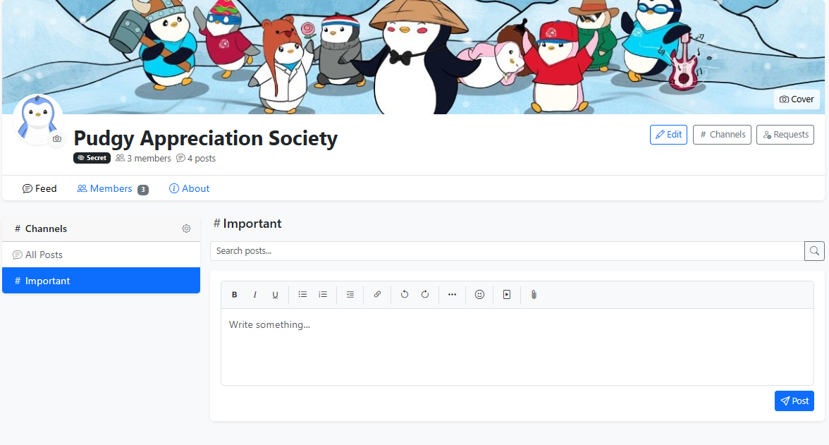 Inside each group, owners and moderators can create channels to organize posts by topic: General, Announcements, Off-Topic, or anything that fits. Channels can be reordered with drag-and-drop and deleted when they're no longer needed (posts move back to the default feed automatically).