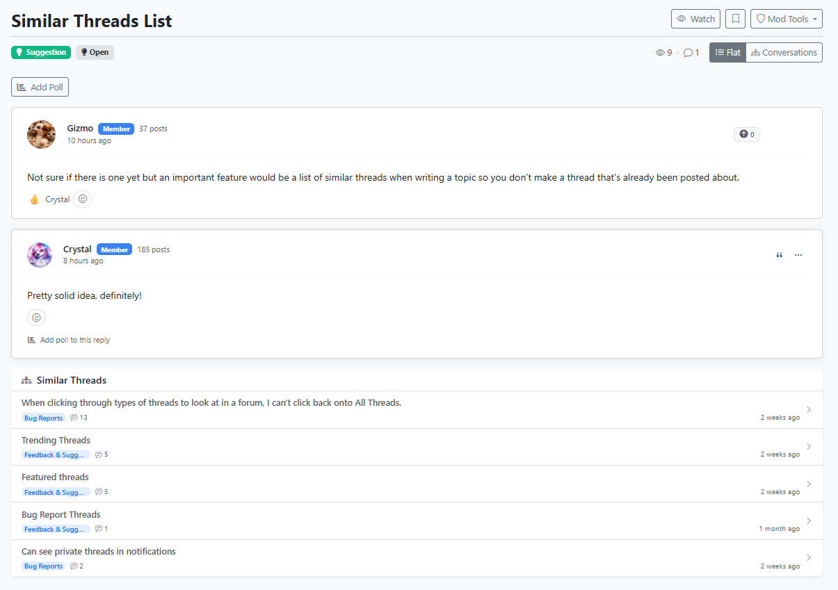 Not sure if there is one yet but an important feature would be a list of similar threads when writing a topic so you don't make a thread that's already been posted about.